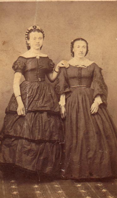 | This is one of my favorites, taken, I believe, just prior to 1865. On the back is written: "left Aunt Hoffman, right Grandma Mrs. Geo. Henze." If you recognize either of these ladies, please notify me. They are a part of my family and, perhaps, yours too. And I would like to know their given names. UPDATE: These ladies have been tentatively identified....... Left: Amalia (Henze) Hoffmann Right: Caroline Wilhelmine Amalia (Nicolai) Henze |