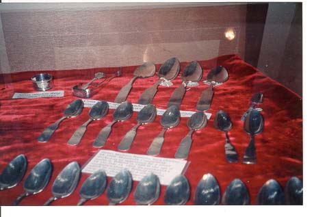 Photo of silverware made by James Madison Barrows, son of Samuel and Hannah Mayo Barrows, born October 19, 1809. He owned and operated a Silversmith Shop in Tolland. His works are on display at the Tolland Historical Society at the Old Jail.